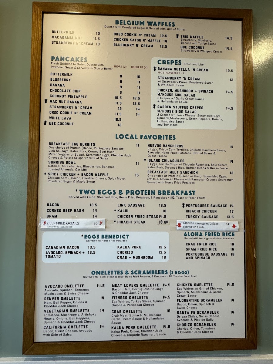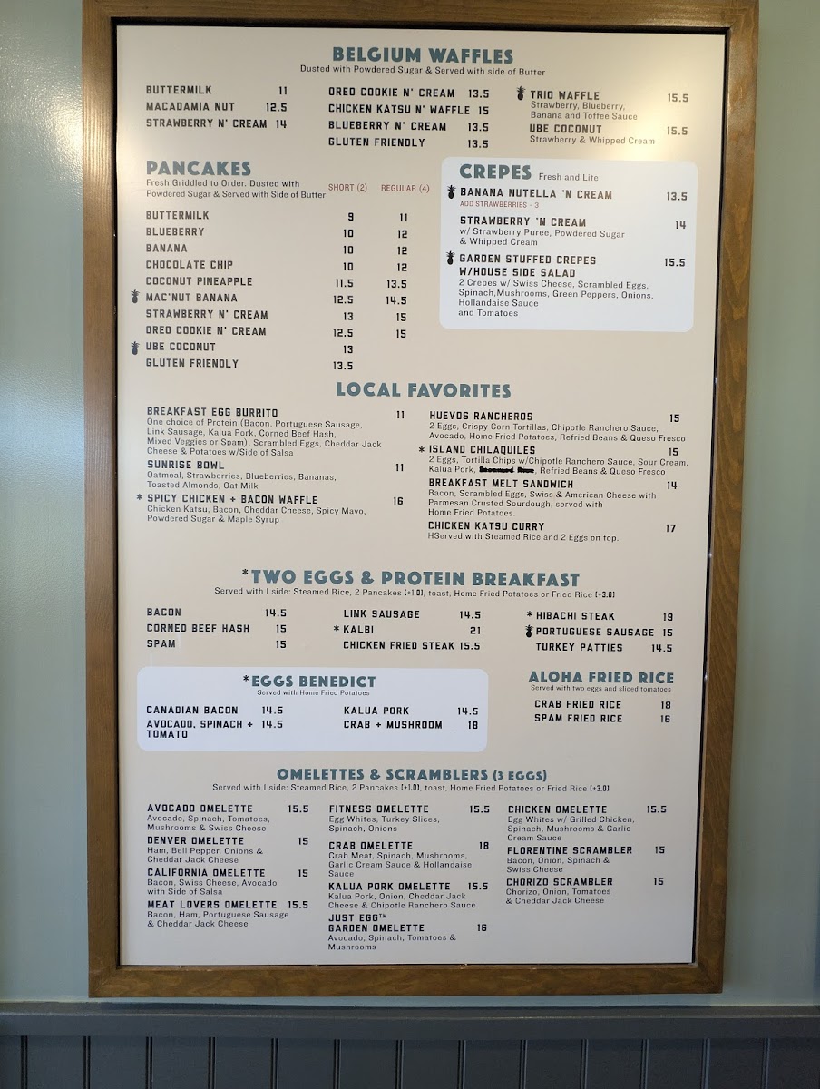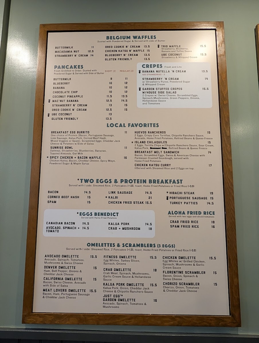 The menu features classic pancakes, waffles, and French toast alongside unique options like the Captain Mac Nut French Toast or the Kahlua Pork Omelette. You’ll also find a range of scramblers, sandwiches, and all-day breakfast dishes that bring warm, familiar flavors with a subtle creative touch.