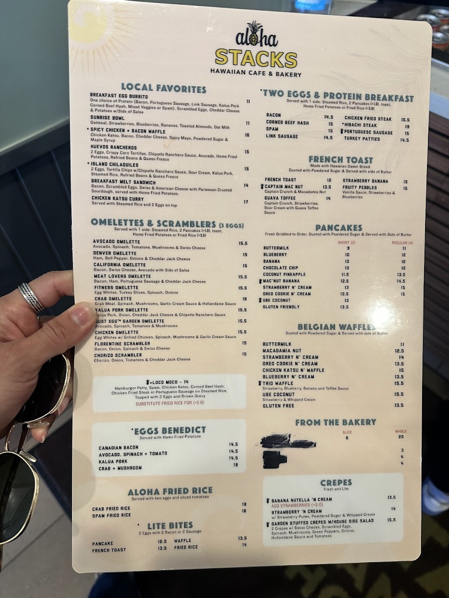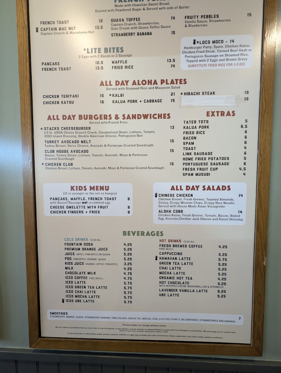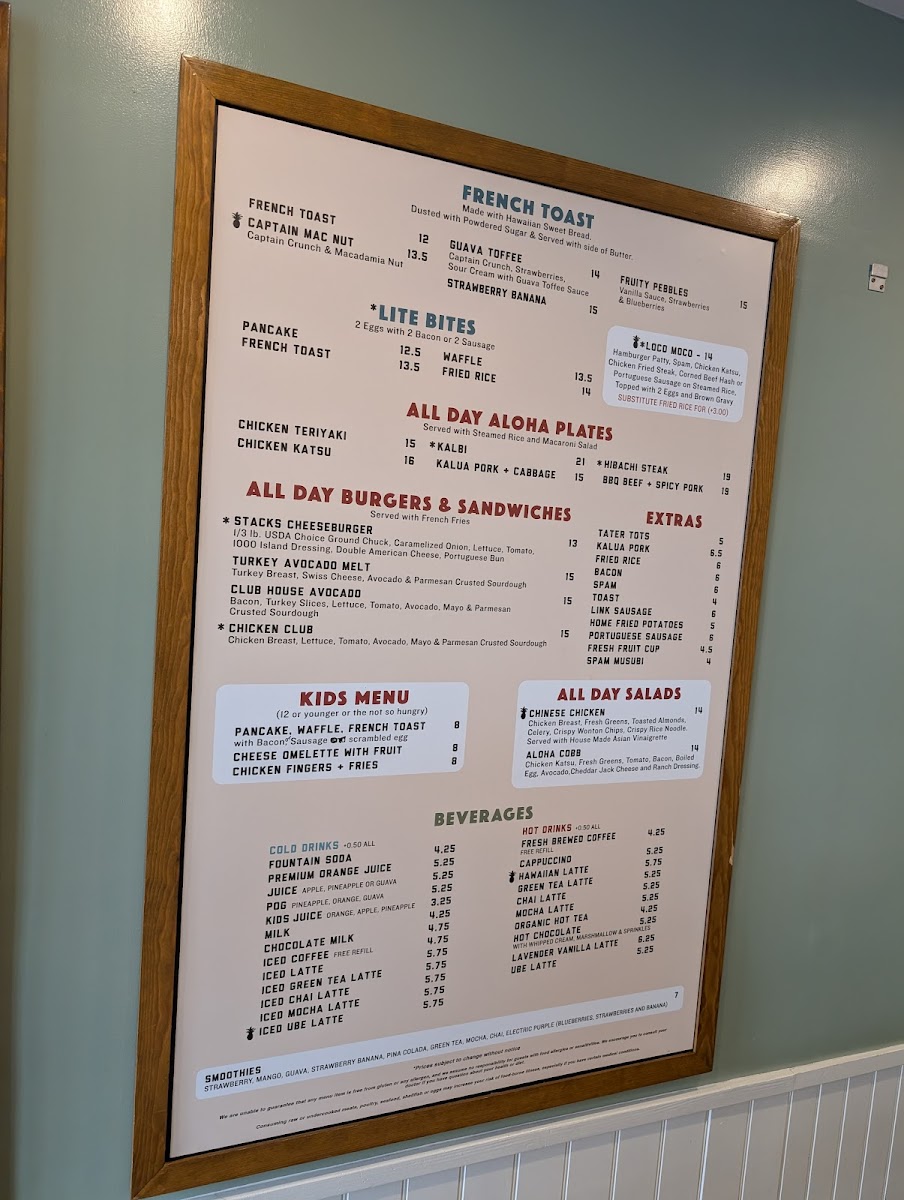 The menu features classic pancakes, waffles, and French toast alongside unique options like the Captain Mac Nut French Toast or the Kahlua Pork Omelette. You’ll also find a range of scramblers, sandwiches, and all-day breakfast dishes that bring warm, familiar flavors with a subtle creative touch.
